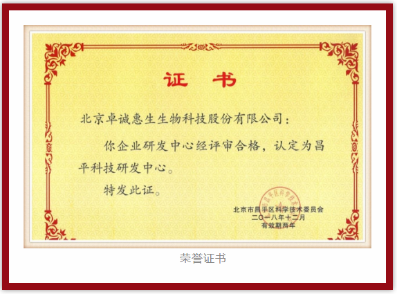 2018年12月,北京市昌平區(qū)科學(xué)技術(shù)委員會(huì)認(rèn)定北京卓誠惠生生物科技股份有限公司研發(fā)中心為昌平科技研發(fā)中心,并頒發(fā)榮譽(yù)證書,熱烈祝賀?。?!