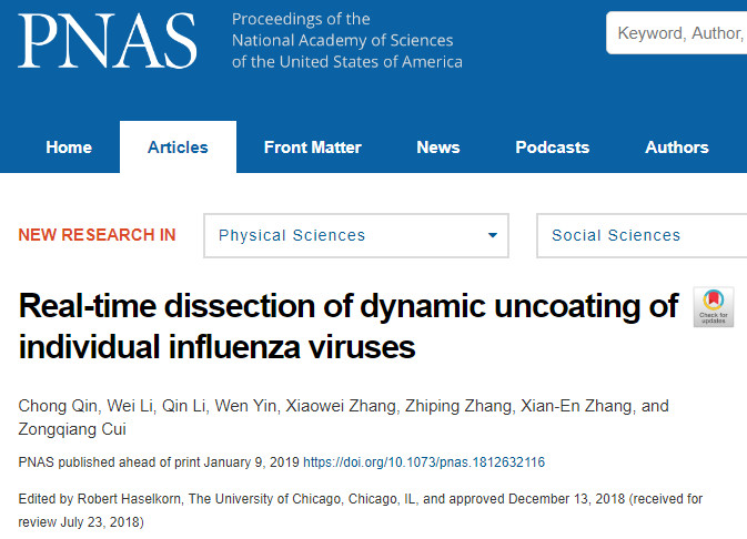 病毒學(xué)國(guó)家重點(diǎn)實(shí)驗(yàn)室崔宗強(qiáng)團(tuán)隊(duì)追蹤到單個(gè)流感病毒脫殼過(guò)程