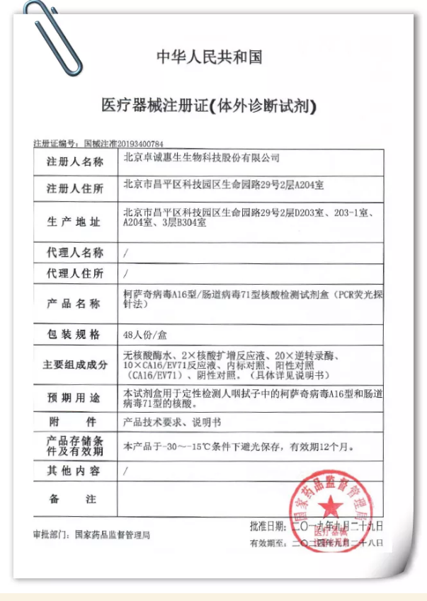 北京卓誠(chéng)惠生生物科技股份有限公司研發(fā)的柯薩奇病毒A16型 腸道病毒71型核酸檢測(cè)試劑盒(PCR熒光探針?lè)ǎ┱将@得醫(yī)療器械注冊(cè)證,隆重上市!