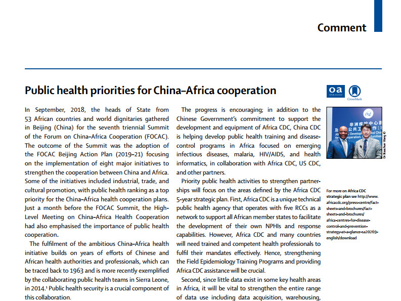 4月3日,中國(guó)疾控中心主任高福院士和非洲疾控中心主任約翰·肯格松在《柳葉刀公共衛(wèi)生》雜志聯(lián)合發(fā)表“中非合作、公衛(wèi)先行”的評(píng)論文章。