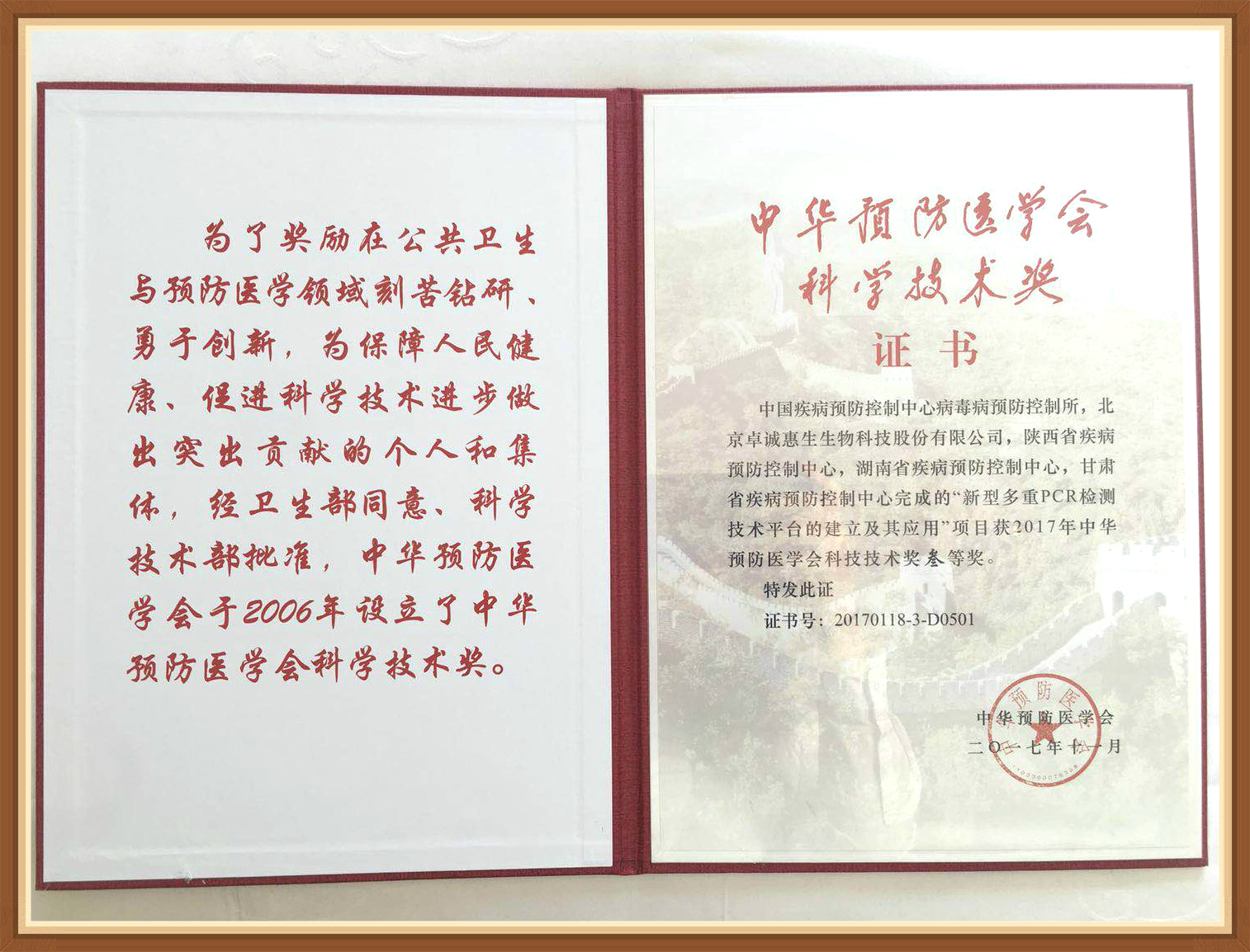 - 中華預防醫(yī)學會科學技術獎一等獎